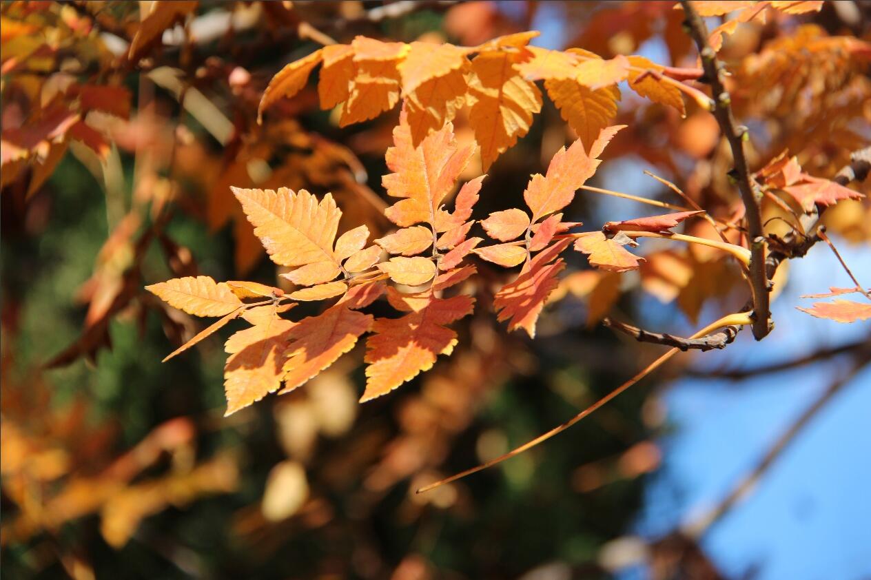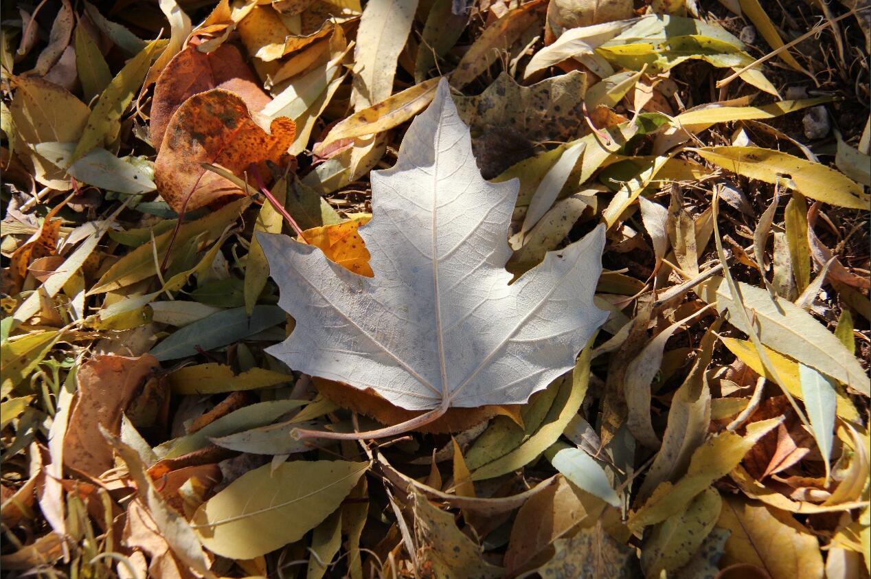 我的镜头继而捕捉到枝头生命的韧性(图2-1)。叶片在枝干上顽强伸展,享受着最后的阳光,展现出生命在面对必然规律时的从容与顽强。而当我俯身大地,则在落叶群中发现了个体的独特(图2-2)。那片枫叶,在各色各样的枫叶中居然一反寻常地呈现出奶白色。卓尔不群,它启示我,即使在集体中,每个生命都拥有不可替代的光芒与价值。