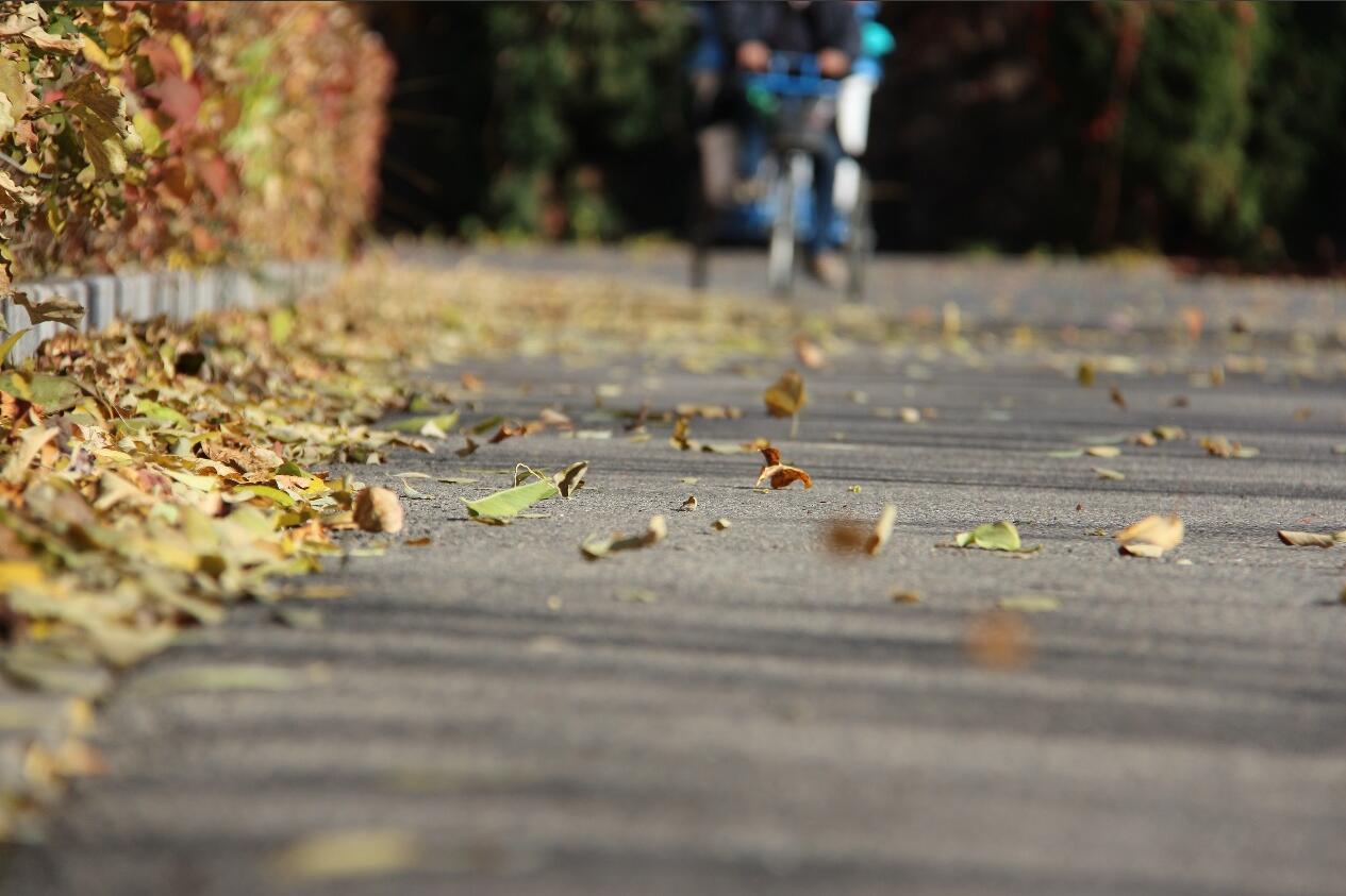 旅程从一片光下的红叶开始(图1-1)。它沐浴在阳光中,脉络清晰,以最炽烈的红色对抗着湛蓝的天际,仿佛在诉说着生命在落幕前最后的辉煌。这并非凋零的悲歌,而是一种完成的庄严。视线延伸,整条林荫道已被秋色浸染(图1-2)。落叶随风起舞,而远处那位缓缓骑行的环卫工人的身影,为这幅静物画注入了动人的生机。他不仅是场景的一部分,更是这美景的守护者。