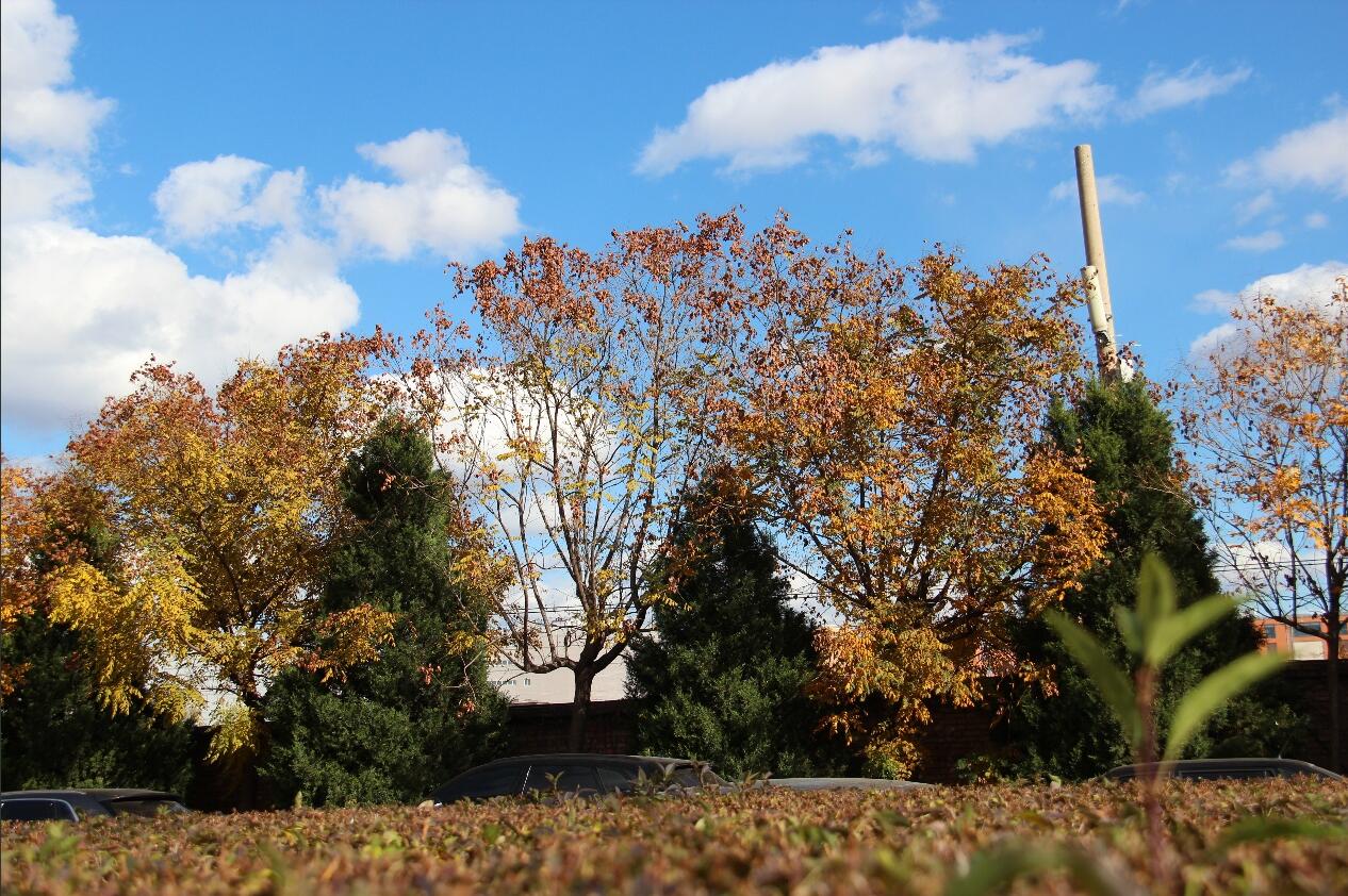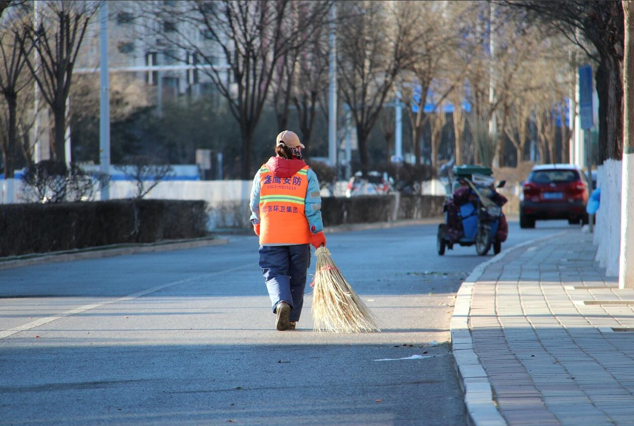 最终,我的视野归于广阔(图3-1,图3-2)。厚实的落叶覆盖着大地,笔直的白桦林伸向天空,而光影尽头(图4-1),那位在校门口默默清扫的环卫工人,在冬日暖阳下构成了最温暖的风景。他手中的扫帚,画出的不仅是洁净,更是对这片土地最深沉的敬意。这次创作让我深刻体会到,校园的秋冬之美,远不止于自然的变幻。那抹逆光的红,是生命的壮丽;那道忙碌的身影,是温暖的底色。美,不仅存在于天地之间,更闪耀在那些默默守护这片天地的劳动者身上。秋冬的沉寂,因这份守护而充满暖意。