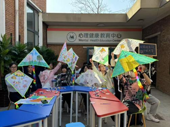 两校区共900余名学生参与风筝绘制活动。学生们在风筝上写下“学会接纳自己”等寄语,用艺术表达对未来的憧憬。